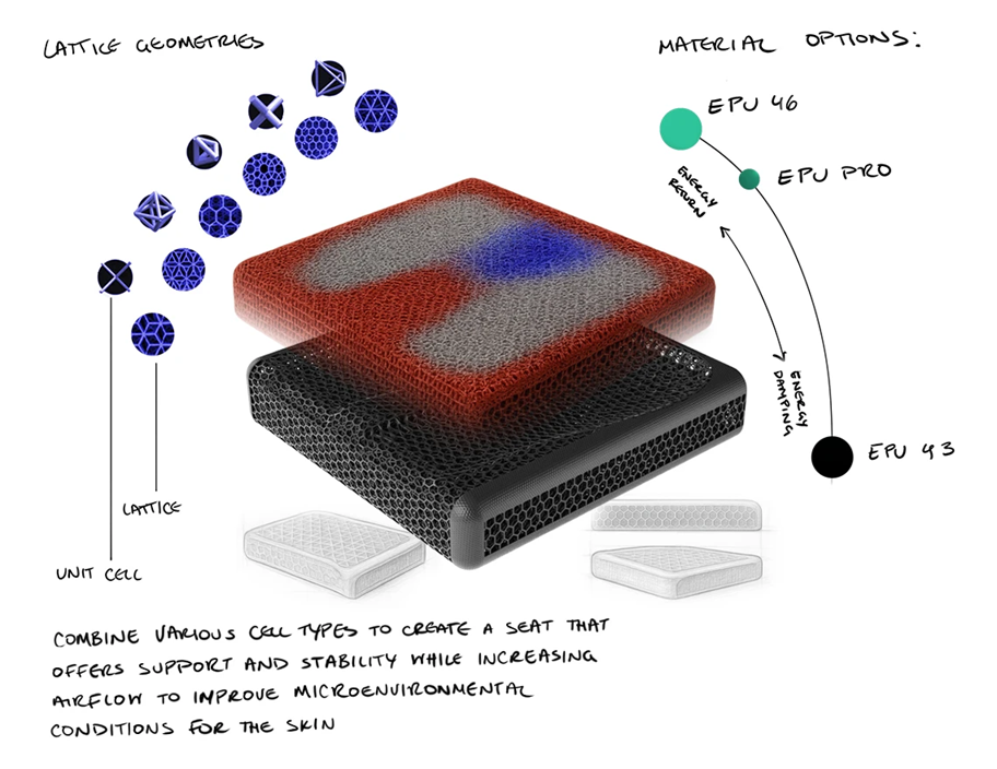 Carbonプラットフォームを活用して、より通気性が高く快適な車いす用クッションを設計しましょう。複数のゾーンを持つラティス構造を用いれば、快適性と機能性の両方を調整でき、さらに個々のユーザーに合わせたカスタマイズも可能です。安定性を保ちながら圧力を分散し、フォーム素材よりも皮膚保護性を高め、温度上昇を抑えられます。 |
